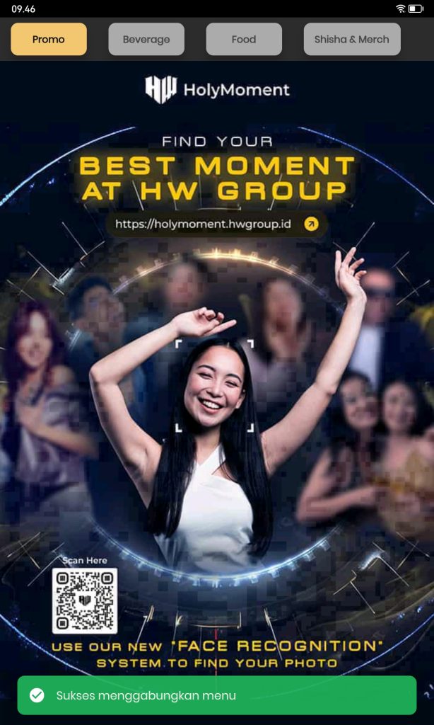 Menampilkan kategori menu yang tersedia pada masing-masing Outlet ( Promo-Beverages-Food-Shisha & Merch )